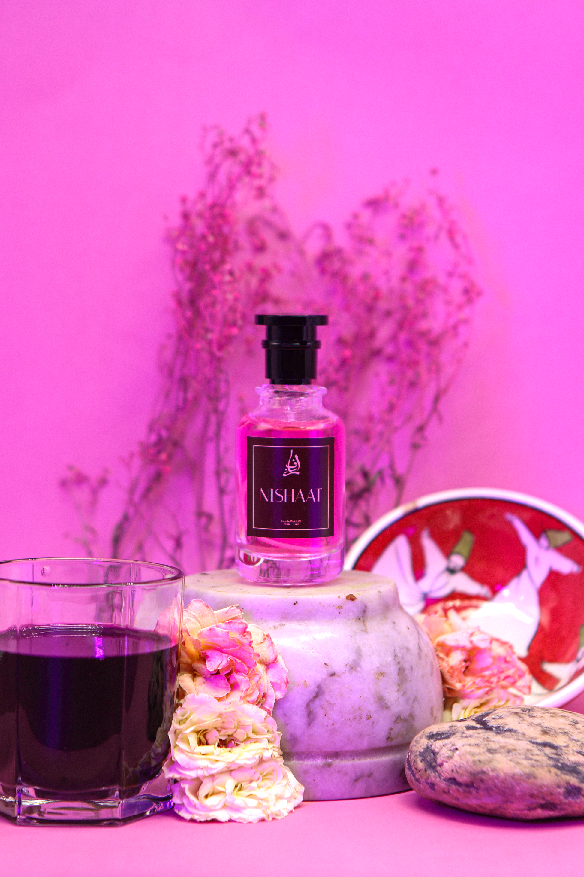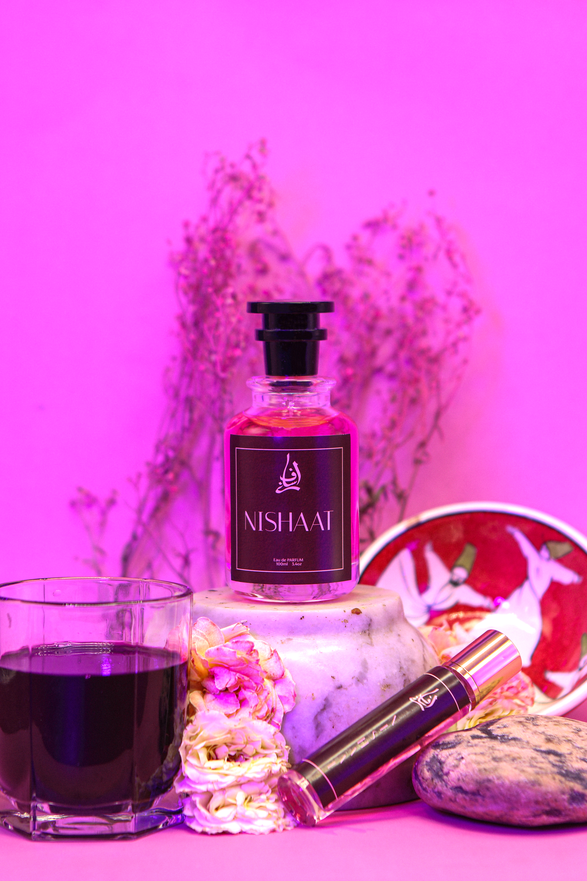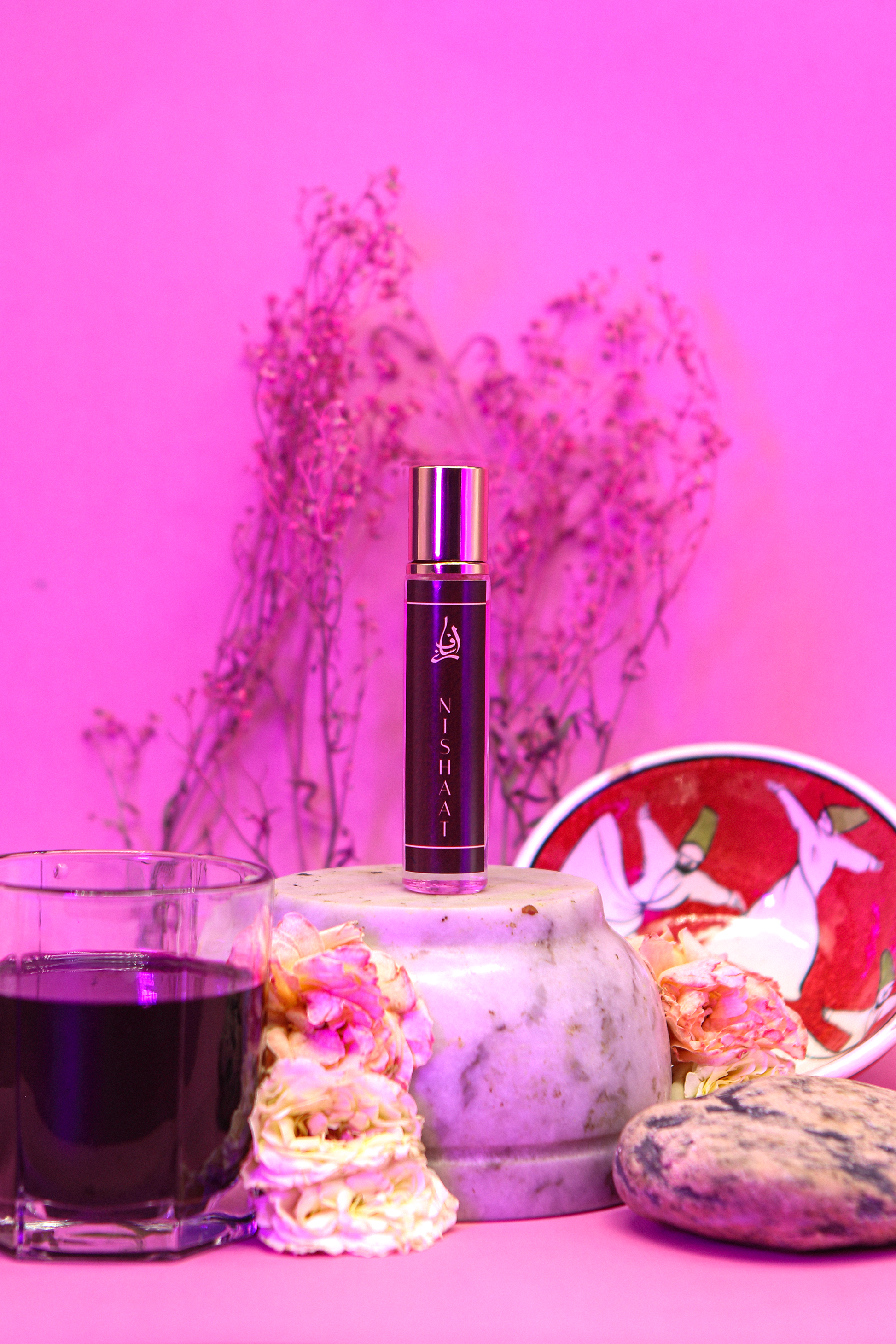 Nishat is a fragrance born from this mystical inspiration—a sensual and warm creation that awakens the senses. A lush bouquet of sweet fruits—Passion Fruit, Peaches, and Pears—blends harmoniously with Raspberries and Cassis. The delicate touch of Lily-of-the-Valley evokes the softness of a caress, while the warmth of sun-kissed sand intertwines with the alluring depth of Heliotropine. Strengthened by the intensity of Patchouli and the sensual embrace of Musk, Nishat is a potion of enchantment. Like the mystical elixirs of ancient legends, it captivates all who wear it, leading them on a journey through mystery, wonder, and boundless emotion, leaving behind an unforgettable trail of intrigue and allure.
